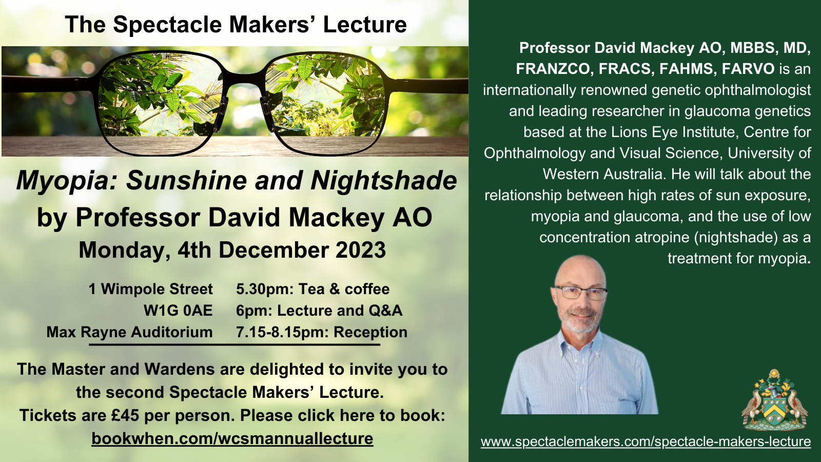 Spectacle Makers can book now to attend this lecture at 1 Wimpole Street, Marylebone, W1G 0AE, Monday 4th December from 5.30pm. The evening will begin with teas, coffee and refreshments before being seated for the lecture to begin at 6pm. The lecture will be followed by a short Q&A session from 7-7.15pm. Spectacle Makers and their guests are invited to stay for a reception at the Royal Society of Medicine, which will finish at 8.15pm.